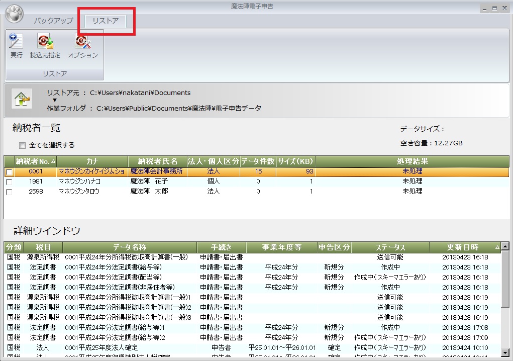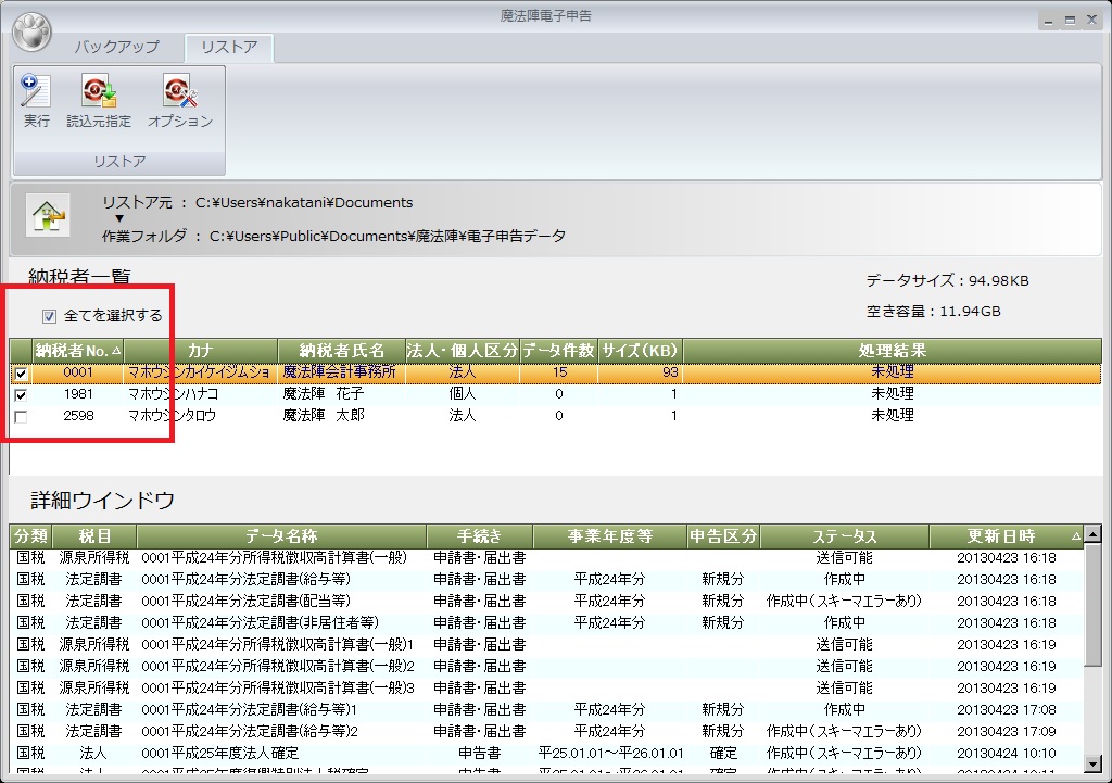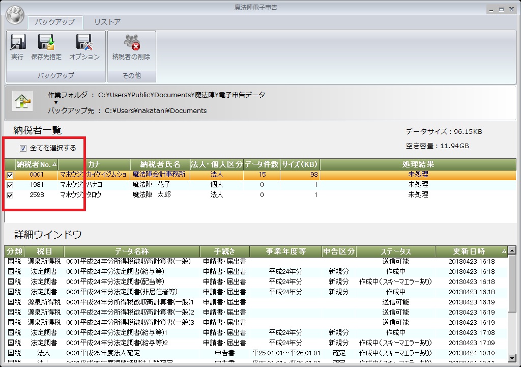 バックアップ(リストア)を行いたい納税者にチェックをいれてください。納税者単位でバックアップ(リストア)を行います。