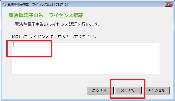 ライセンスキー入力画面が表示されたら、ハンドから発行しております電子申告のライセンスキーをテキストエリアに入力し、<次へボタン>をクリックしてください。