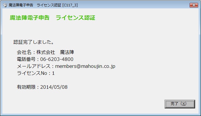 完了画面が表示されますので、<完了ボタン>で閉じてください。これでライセンス認証は完了です。