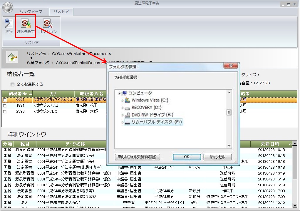 - <保存先指定>のボタンをクリックすると「フォルダの参照」ダイアログが表示されますので、読込元(USBメモリ、FD、MO等)のドライブ及びフォルダを指定し、 <OKボタン>をクリックします。