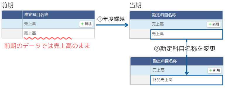 例えば、前期に「売上高」としていた勘定科目を当期に「商品売上高」に変更した場合、前期の勘定科目は「売上高」のまま変更されず、履歴も残りません。