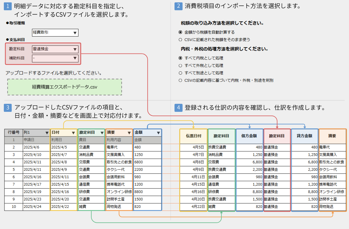 経費精算システムなどの外部システムで作成された、仕訳形式のデータを取り込む場合に適しています。