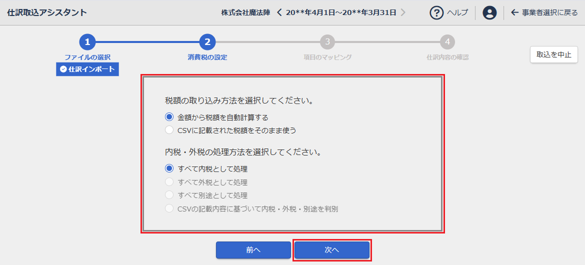 消費税項目のインポート方法を設定し、[次へ]をクリックする