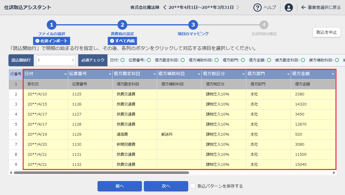 CSVファイルの内容が表示されるので、各列に対応する仕訳項目を指定する