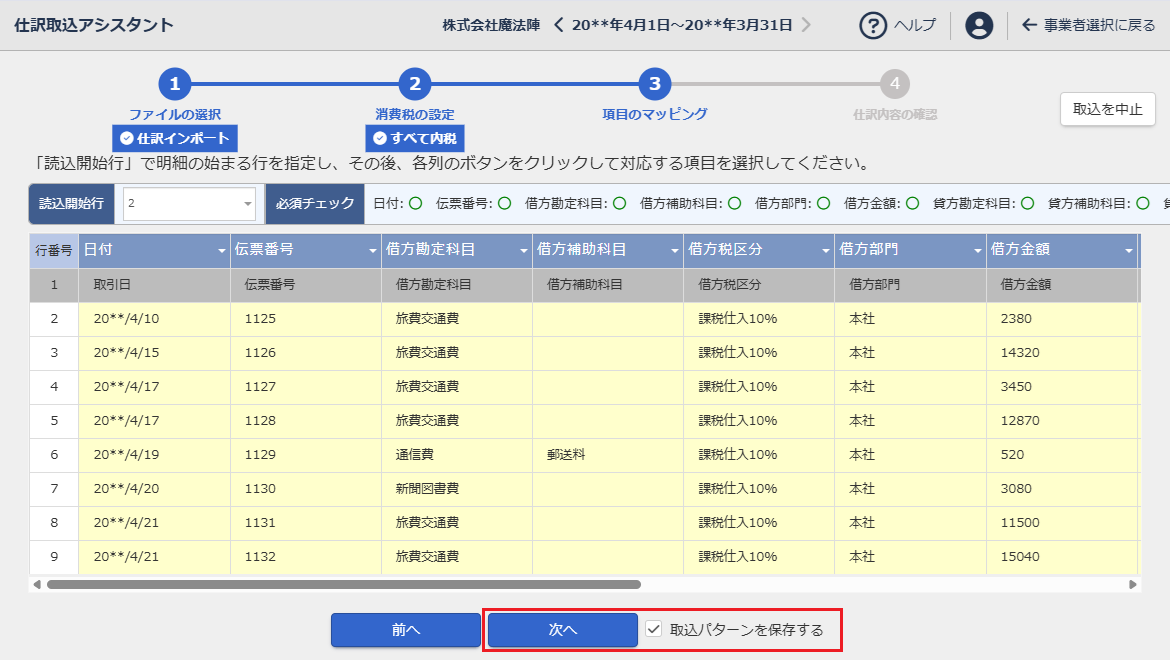 [取込パターンを保存する]にチェックを入れて[次へ]をクリックする