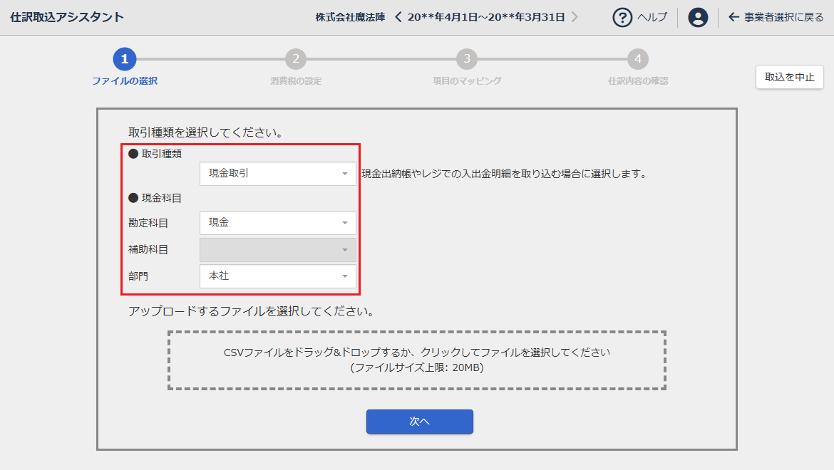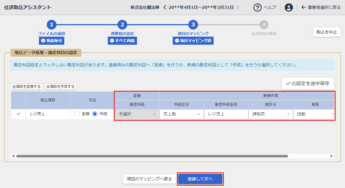 本ステップでは、勘定科目、補助科目、部門、消費税区分ごとに対応付けを行います。
