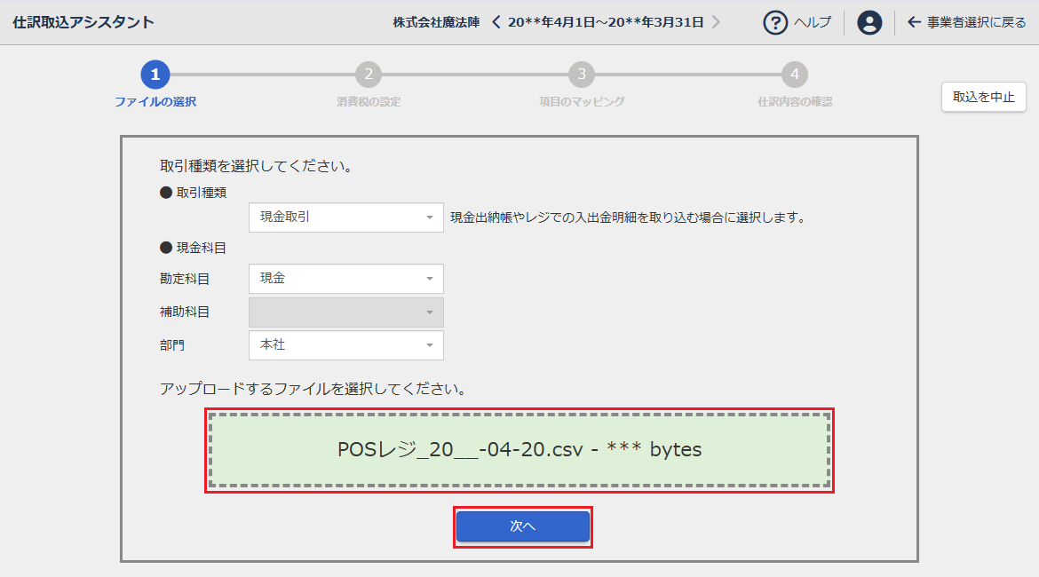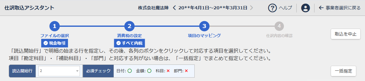 参考: [取込を中止]をクリックすると、インポート内容を破棄して仕訳取込アシスタントのTOP画面に移動します。 -