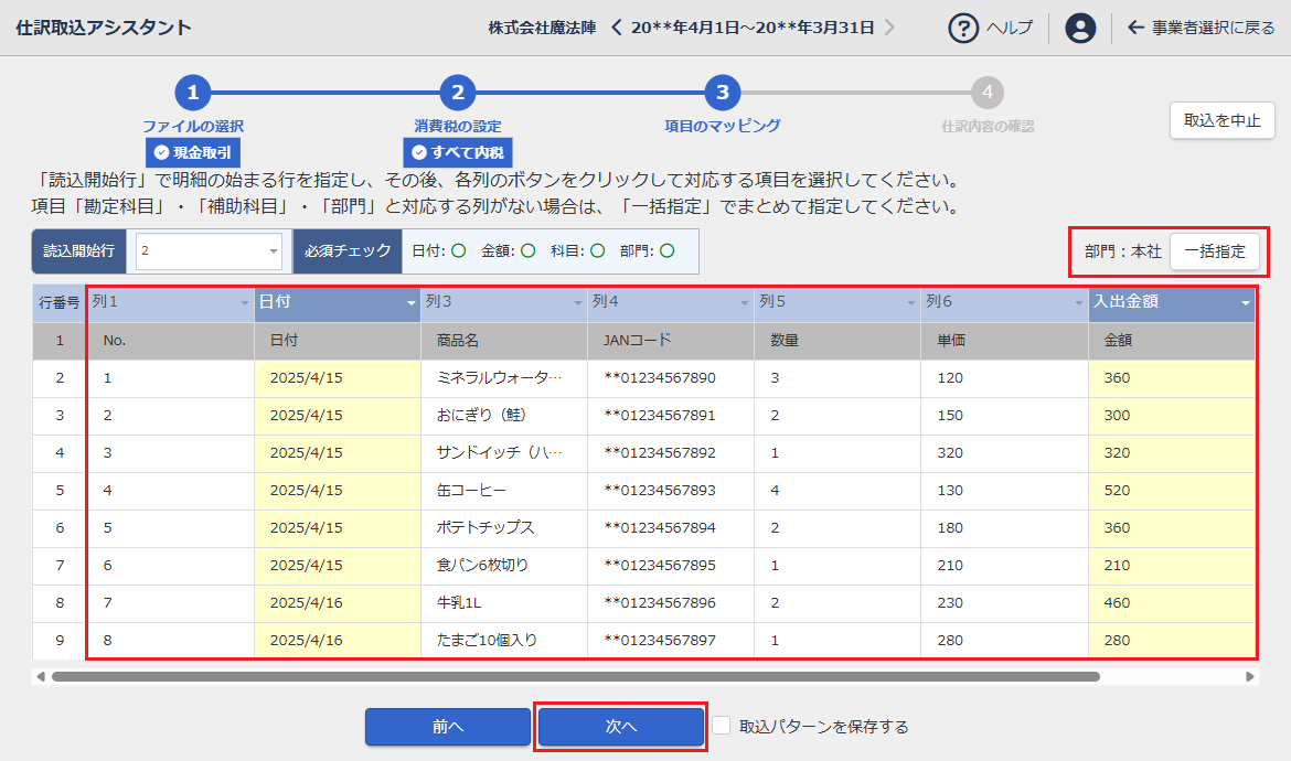 CSVファイルの内容が表示されるので、各列に対応する仕訳項目を指定し、[次へ]をクリックする