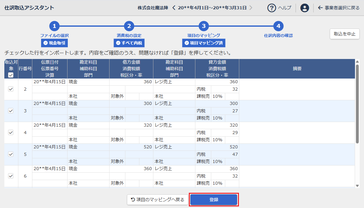 - 取込対象にチェックが入っている仕訳をインポートします。