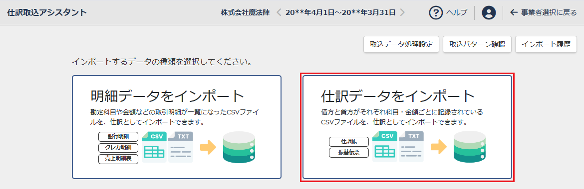 ここでは仕訳データのインポートを例に説明しますが、明細データのインポートも同様の操作となります。