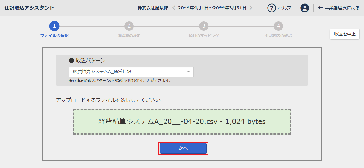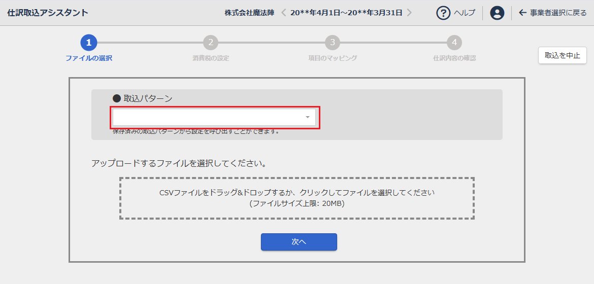 取込パターンは、ファイル選択画面で選択できます。