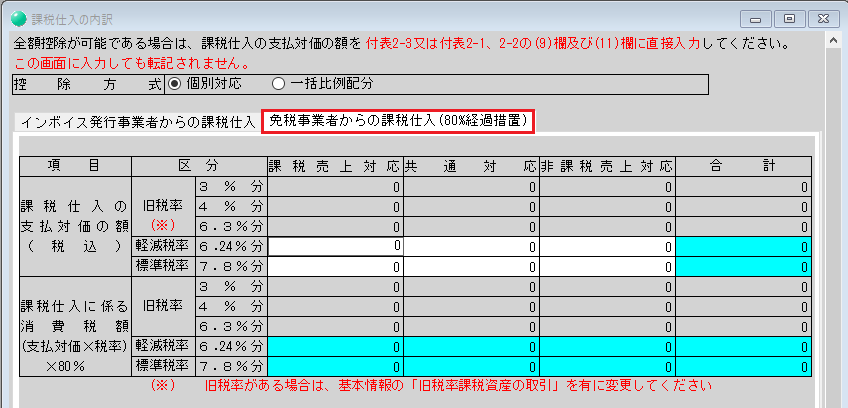 課税仕入の内訳画面で、タブを切り替えて入力します。